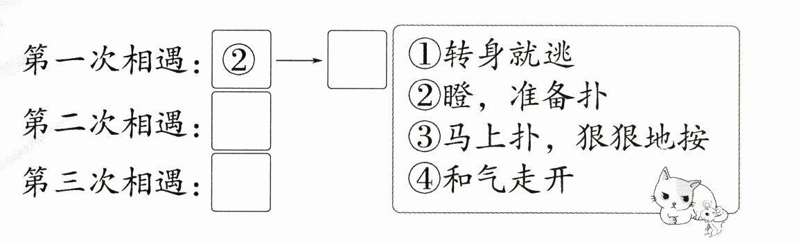 (3) 老鼠和猫三次相遇,猫的反应不同。照样子,根据故事内容,将序号填写在方框里。(6分)