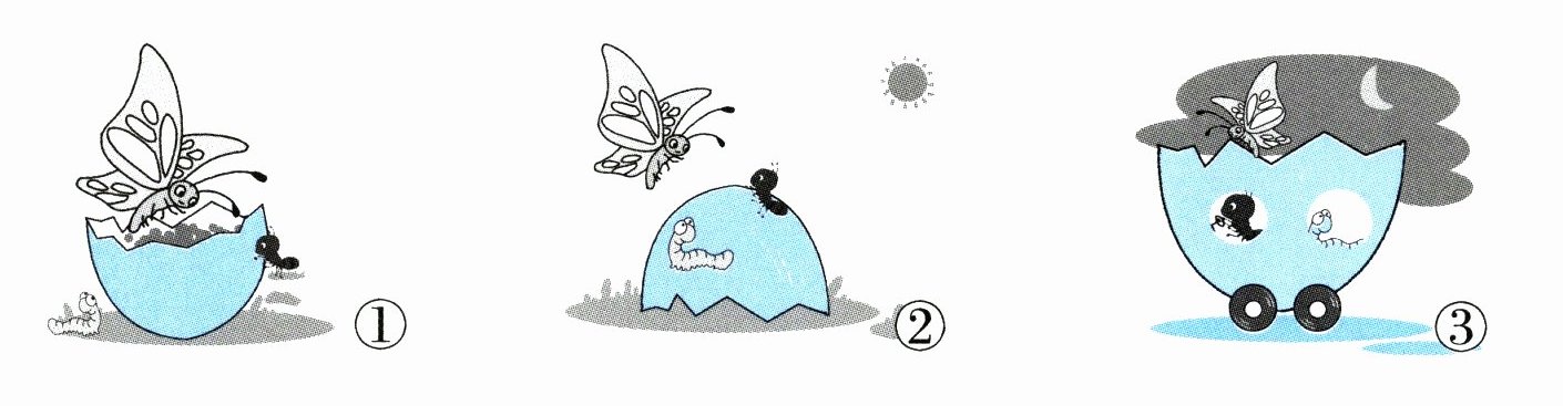 第二天,小虫子、蚂蚁和蝴蝶又带着鸡蛋壳出发了,他们做了哪些有趣的事情?请你仔细观察图片,用上下面的词语写一写!