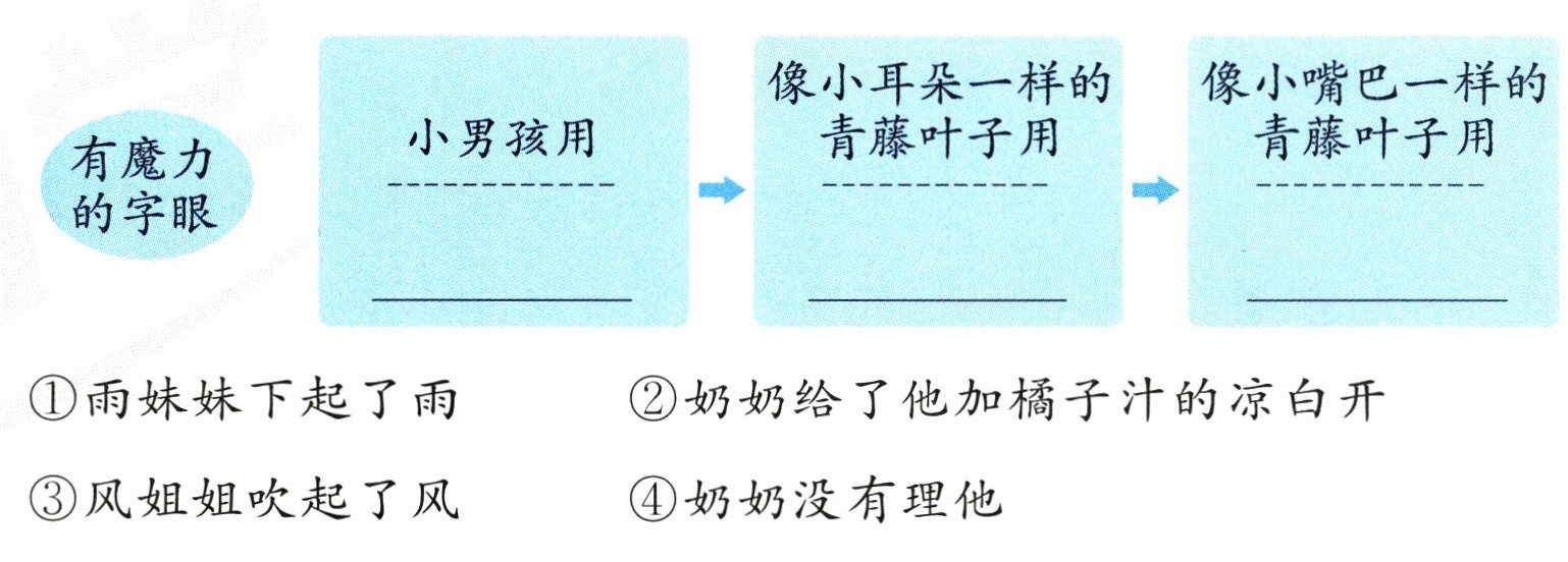 4. (新题型)有魔力的字眼的“魔力”体现在哪儿?选一选(填序号),并把故事讲给同学听。(6分)