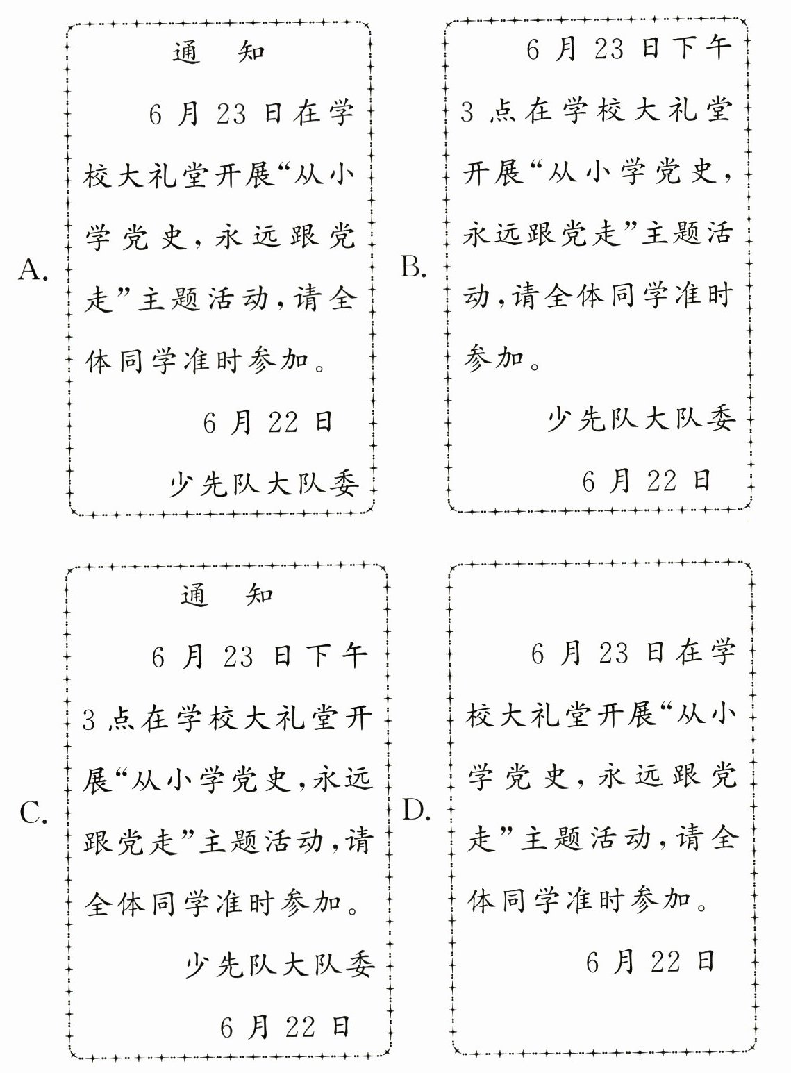 4.阳光小学要开展“从小学党史,永远跟党走”的主题活动,下列通知中格式正确的一项是( )(2分)
