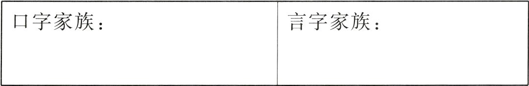 3. 晶晶想把人物卡写具体,但写的时候发现把口字家族和言字家族的成员混在了一起,还弄丢了偏旁,请你帮忙把偏旁补充完整,并分一分类(填序号)。(10分)