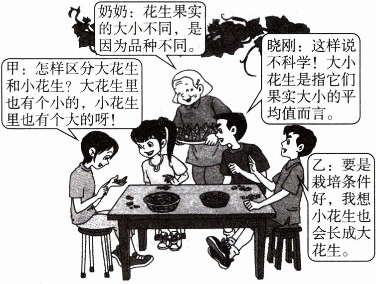 ★19. 晓刚带同学去奶奶家玩,奶奶拿出了大、小两种花生请他们品尝。他们一边吃着,一边产生了疑问:“花生果实的大小不同是由什么原因造成的?”请根据右上图中几个人的对话回答问题。