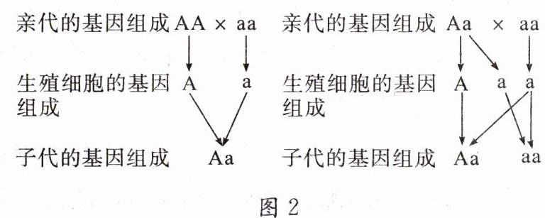 (3)子代黑毛小鼠的基因组成可能为AA,也可能为Aa。若要判断某只子代黑毛小鼠的基因组成,可用该小鼠与白毛小鼠杂交,根据后代性状表现进行判断,原理如图2所示。根据图2可以判断,若后代表现为__________,则该黑毛小鼠的基因组成为AA;若后代表现为__________,则该黑毛小鼠的基因组成为Aa。