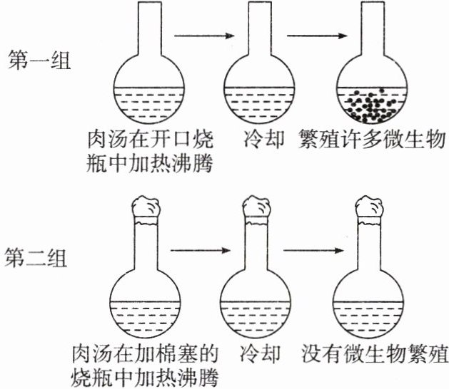 (1)杀死肉汤中原来存在的微生物。(2)肉汤中的微生物在冷却前被杀死,排除了实验干扰。第二组加棉塞,空气不能进入,没有微生物,第一组不加棉塞,空气可以进入,有微生物,这说明微生物来自空气。(3)不能。只做第一组实验,无对照实验,无法说明微生物不是瓶内自发产生的。