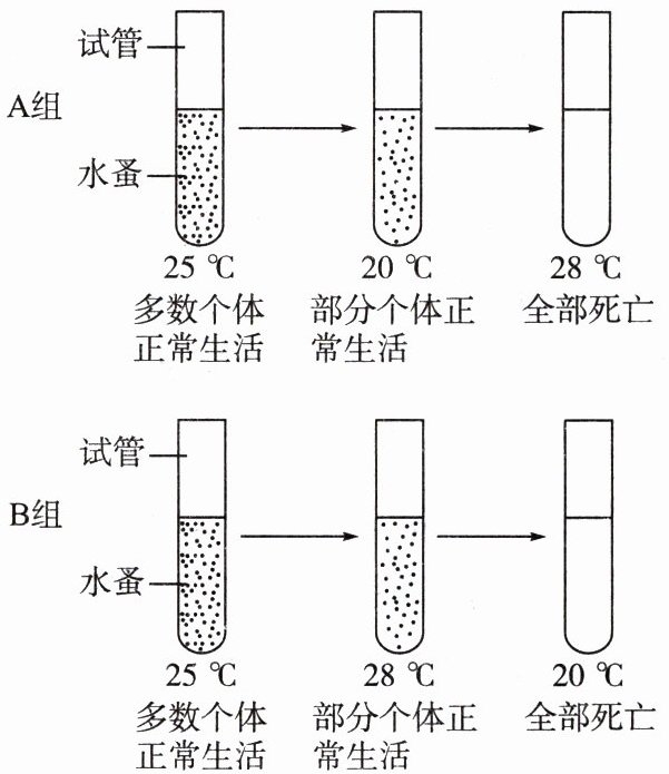 18. 水蚤是一种水生小动物。某兴趣小组的同学用等量的水蚤分别做了A、B两组实验:水温的改变是实验的唯一变量,其他条件均相同;水蚤在不同的水温中均保持12小时。实验过程和实验现象如下图所示。请回答下列问题。