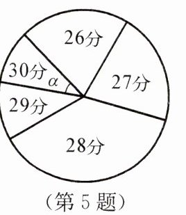 5. 为了解某校八年级学生体育测试成绩情况,现从中随机抽取部分学生的体育成绩整理如下表,并绘制成如图所示的扇形统计图,其中,扇形统计图中的圆心角α为36°。