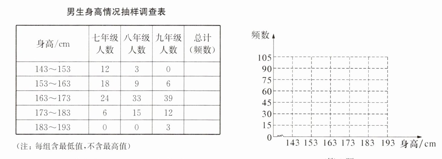 |身高/cm|七年级人数|八年级人数|九年级人数|总计(频数)|