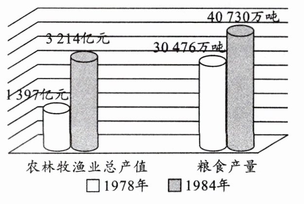 7.(2024·安徽)右图所示为1978年与1984年全国农林牧渔业总产值和粮食产量的统计数据,其变化主要是由于家庭联产承包责任制的实行 ( )