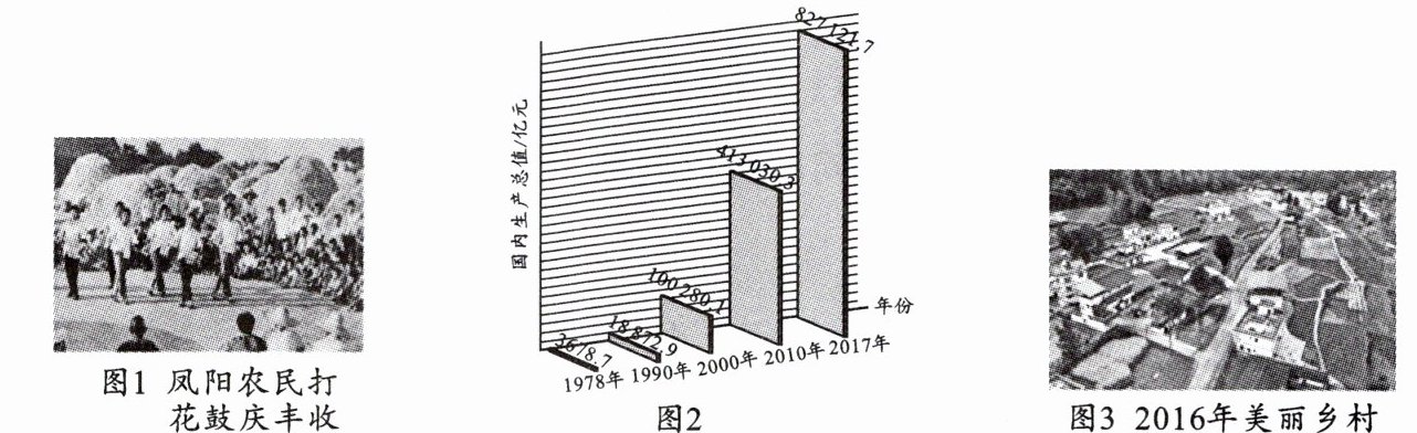 (1)改革开放以来国内生产总值持续增长;2000年国内生产总值增长幅度最大。(2分)(2)1978年家庭联产承包责任制的实行,极大地调动了农民的生产积极性,促进了农业大丰收,图1体现了这一历史场景。(2分)此后,这一制度逐步在全国推开,改革在农村取得成功,接着,改革的浪潮从农村涌向城市,城市改革全面展开。经济体制改革的不断深入,对外开放的纵深推进,促使国内生产总值持续增长,图2对此进行了数据分析。(2分)随着改革开放的深人,国内生产总值的持续增长,人民要求提高生活质量与改善居住环境,图3体现了这一成果。(2分)(3)坚持中国共产党领导;坚持改革开放;坚持以人民为中心;坚持解放和发展生产力。