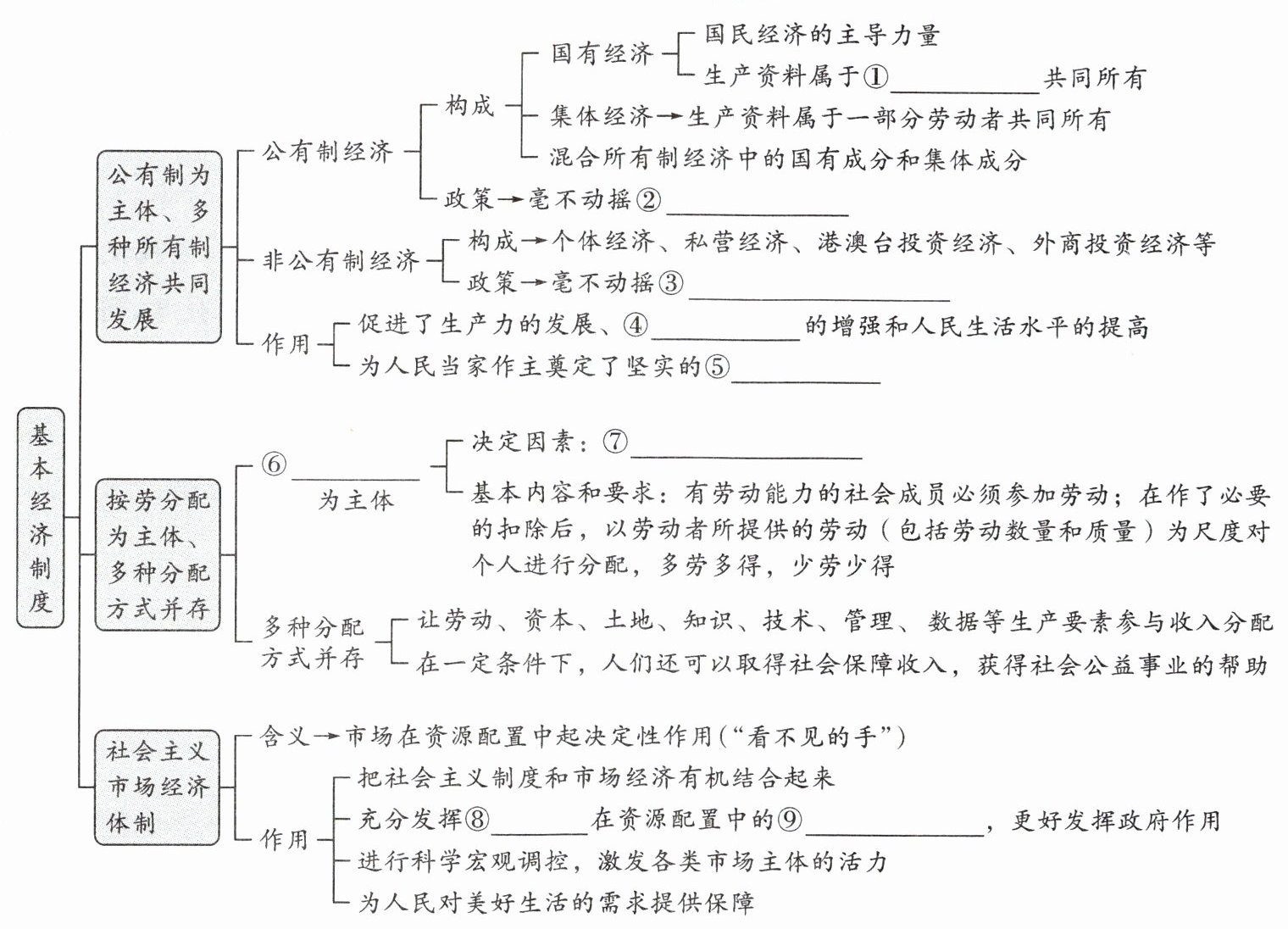 ①全体人民 ②巩固和发展 ③鼓励、支持、引导 ④综合国力 ⑤物质基础 ⑥按劳动配 ⑦生产资料公有制 ⑧市场 ⑨决定性作用