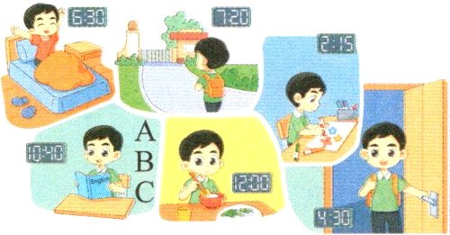 My name is Ben. It is Monday today. I ______ ______ at 6:30. Then I have breakfast at 7:00. And I go to ______ at 7:20. At 10:40, I have an ______ class. At 12 o’clock, I have lunch. I have an ______ class at 2:15. Oh, it’s 4:30. Time to ______ ______.