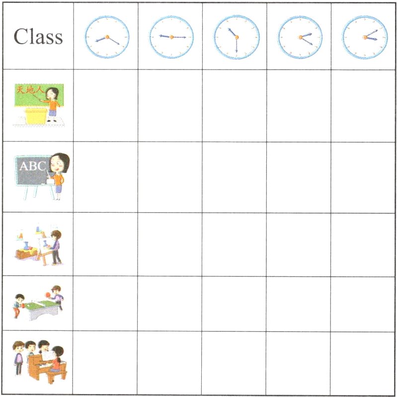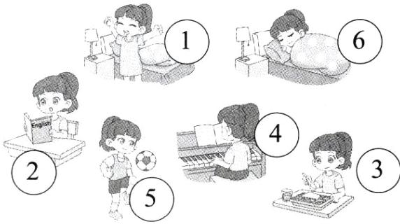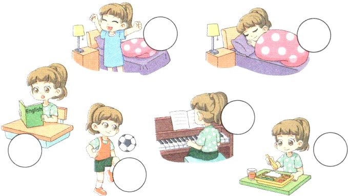 get up; breakfast; go to school; music class; lunch; English class; go home