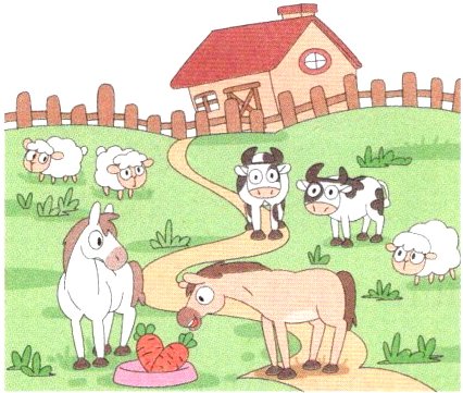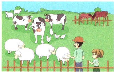 There are many animals on Mr Li’s farm. There are four 1. __________. We can get eggs from them. There are three 2. __________. They are black and white. We can see four 3. __________ and three goats(山羊). What are those two over there? Oh, they are 4. __________. They’re brown.