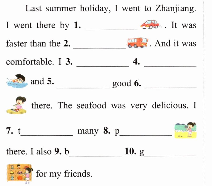 1. car 2. bus 3. went 4. swimming 5. ate 6. food/seafood 7. took 8. pictures/photos 9. bought 10. gifts