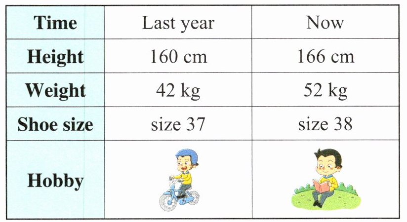 Paul is 1. t__________ than last year. He is 166 centimetres and he is the tallest in my class now. He is also much 2. h__________ than last year. Last year, he 3. w__________ 42 kilograms, but now he is 52 kilograms. He didn’t do exercise at all during the holiday. What 4. s__________ are his shoes? He wears size 38 shoes now. His feet are a little 5. b__________ than last year. What about his 6. h__________? Last year, he loved to 7. g__________ 8. c__________. He thought it was exciting. Now he likes 9. r__________ 10. b__________.