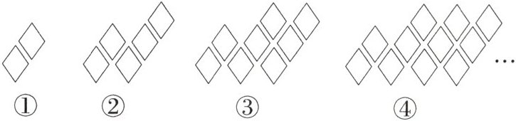4. [新独家原创] 用菱形按如图所示的规律拼图案,第①个图案中有 2 个菱形,第②个图案中有 5 个菱形,第③个图案中有 8 个菱形,第④个图案中有 11 个菱形,……,按此规律,设第$n$个图案中菱形的个数为$y$,则$y$与$n$之间的函数关系式为____________,此函数是__________函数(填“一次”或“正比例”).(M8217002)