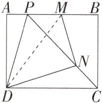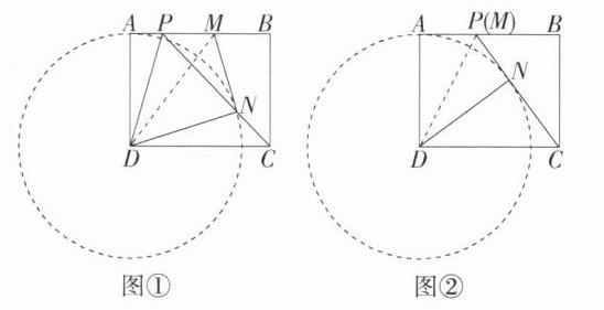 **答案**:10;$\sqrt{20}$ **解析**:由题图可得△CDP的面积等于矩形ABCD面积的一半,所以△CDP的面积为$\frac{1}{2}$AD·DC = 10。 在Rt△APD中,DP=$\sqrt{AD^{2}+AP^{2}}$,所以当AP最大时,DP最大。 由翻折的性质,得DN = DA = 4,所以点N在以D为圆心,4为半径的圆上运动,如图①。 易得当射线CN⊥DN时,AP最大,此时点P与点M重合,∠DNC = 90°,如图②,所以CN=$\sqrt{5^{2}-4^{2}}$= 3。 由翻折的性质可知PA = PN。设PA = PN = x,则PB = 5 - x,CP = 3 + x。 在Rt△PBC中,由勾股定理,得PB² + BC² = PC²,即(5 - x)² + 4² = (3 + x)²,解得x = 2,所以DP=$\sqrt{4^{2}+2^{2}}$=$\sqrt{20}$。