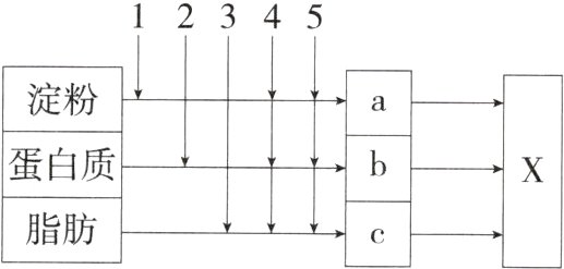 12.核心素养·科学思维(2024河北石家庄四十中二模)如图表示人体的消化和吸收过程,1~5表示消化液(5为肠液),纵向箭头表示消化液对相应物质的消化作用,a、b、c分别表示淀粉、蛋白质和脂肪的最终消化产物。下列说法正确的是(B7231002)( )