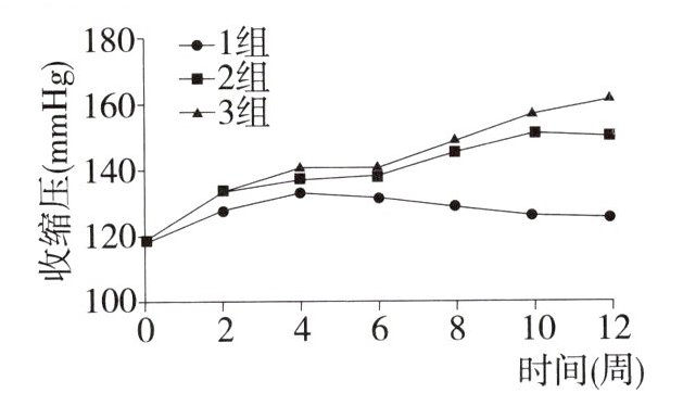 (2)分析曲线图的数据可知:长期高脂饮食会增加高血压发生的风险,证据是连续饲喂大鼠6周以后2组的血压(或收缩压)明显高于1组;且第3组摄入高脂高盐的饮食,患高血压的风险更大。