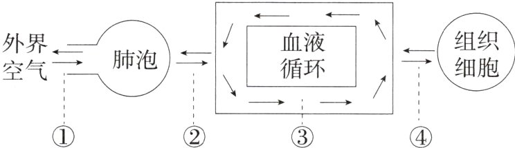 8.识图分析题·模式图 (2024江苏苏州中考,37改编,)严重的肺炎可能导致肺泡纤维化,肺的弹性逐渐丧失,患者会出现长期干咳、呼吸困难、缺氧等症状。如图为人体呼吸过程示意图,肺泡纤维化会使(B7233002) ( )