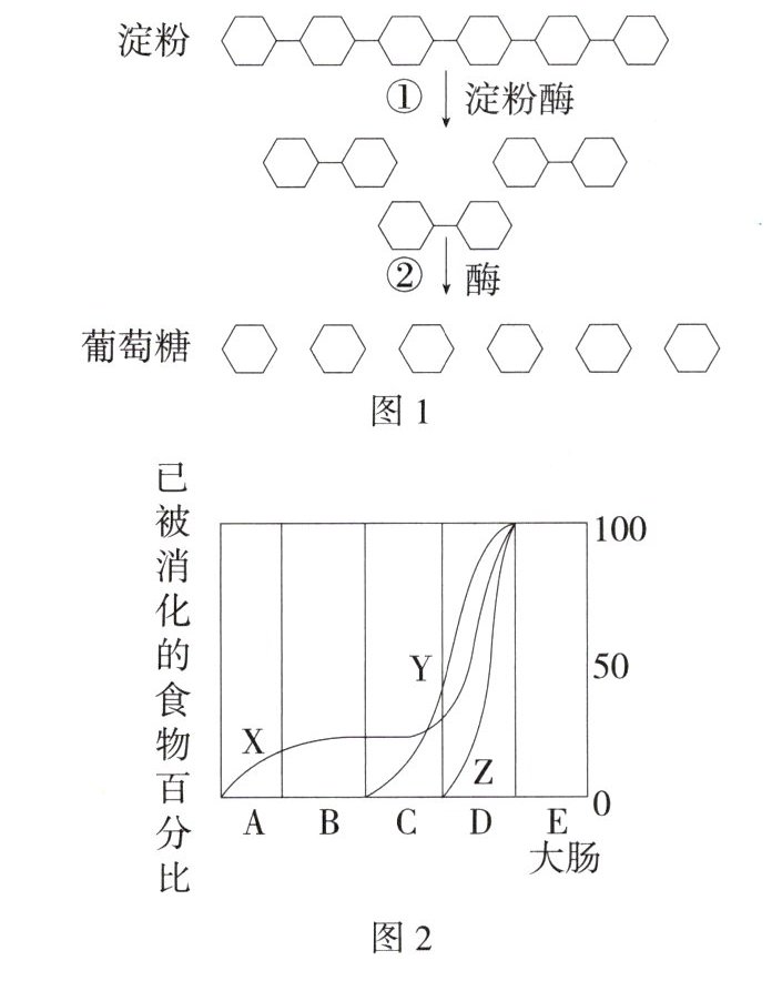 21.[含评分细则]跨数学·曲线图(2024广西银海期中)(8分)“民以食为天”,人们摄食的大分子营养物质,必须先分解为小分子物质,才能被人体细胞利用。图1表示淀粉在消化道内逐步分解的示意图;图2曲线(X、Y、Z)分别表示三大营养物质在消化道中各部位(依次用A、B、C、D、E表示)被消化的程度。请回答: