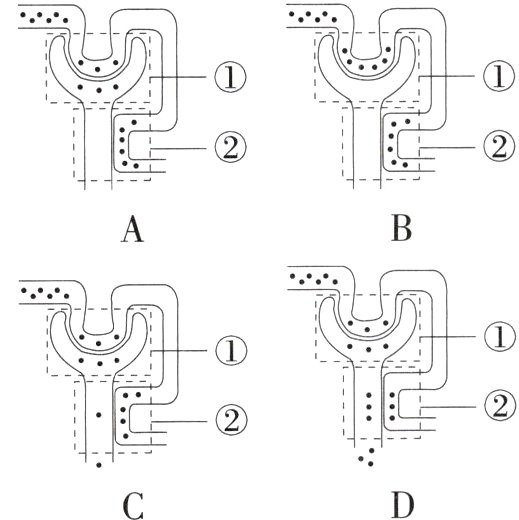 11.识图分析题·模式图 (2024陕西中考A卷)以下是健康人正常情况下尿液形成过程示意图。其中在①②部位发生了重要生理作用,“·”表示某种成分。能模拟尿素排出过程的是(B7234002) ( )