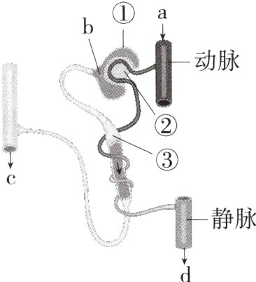 18.核心素养·科学思维 (18分)如图是肾单位结构模式图,①、②、③代表肾单位的三个结构,a、b、c、d代表该处的液体。表格中样品X、Y取自某正常人a、b、c、d四种液体中的两种。回答下列问题:(B7234002)