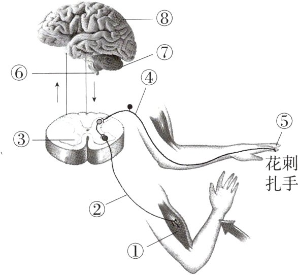 缩手反射属于非条件反射,其神经中枢位于脊髓,A错误;缩手反射的感受器是手部皮肤内的感觉神经末梢,效应器是传出神经末梢及其所支配的肌肉,B错误;痛觉中枢位于大脑皮层,⑦表示的是小脑,C错误。