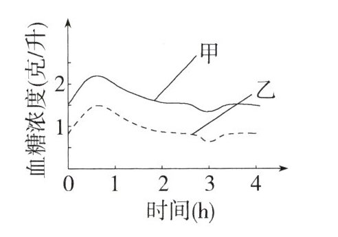 9.[跨数学·曲线图](2023四川眉山中考,15,★☆☆)如图中的甲、乙两条曲线分别表示两个人饭后血糖变化的情况。下列相关分析,错误的是 ( )