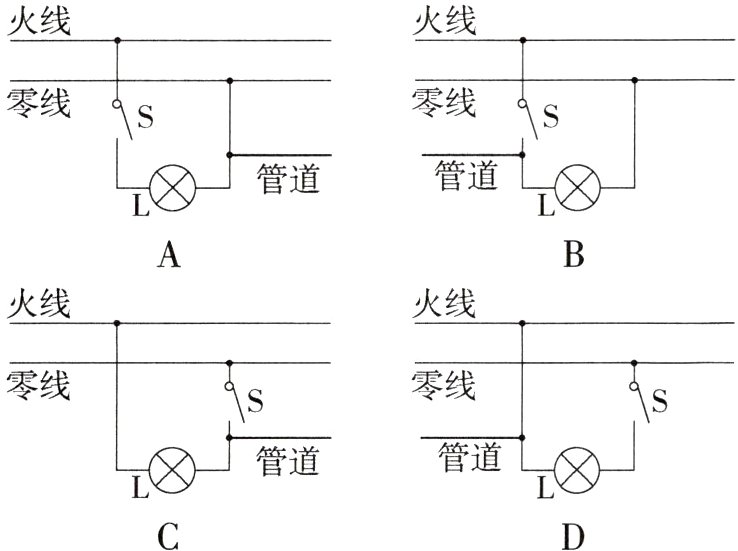2. (2022江苏常州中考)燃气安全检查过程中,技术人员在某住户家中用验电笔测试金属燃气管道,发现:闭合厨房开关S,灯L亮,验电笔氖管发光;断开厨房开关S,灯L熄灭,验电笔氖管不发光,该住户家中,厨房照明电路的导线绝缘皮破损处与管道接触的实际情况是(P9203002)