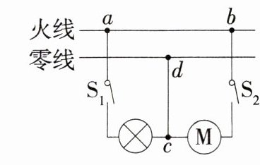 1. 图为小至设计的厨房部分电路,闭合开关S₁和S₂,发现灯泡、电动机都不工作,家里的空气开关没有跳闸;保持两个开关闭合,用验电笔测a、b、c、d四点,发现四点都可以使验电笔的氖管发光;则电路中存在的故障可能为(P9203002)