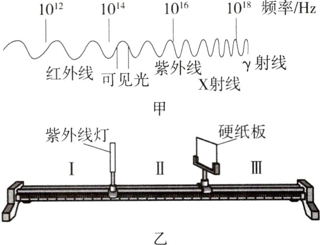 (1)由图甲知,紫外线的频率在电磁波的频率范围之内,因此紫外线属于电磁波;电磁波在真空中的传播速度等于光速,即3×10⁸ m/s。