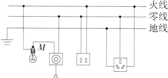 B 灯泡和两孔插座工作时互不影响,所以是并联的,故A错误;M点与零线连接,所以用验电笔接触M点时,氖管不发光,故B正确;开关应接到火线和用电器之间,三孔插座的左孔应接零线,右孔应接火线,上孔应接地线,故C错误;两孔插座的左孔与零线相连,所以将验电笔插入两孔插座的左孔,氖管不发光,故D错误。