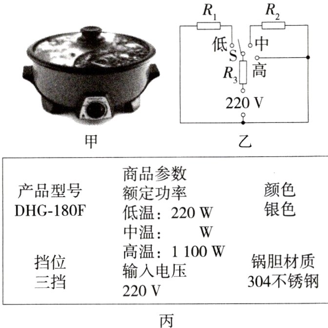 13. [新课标.科学推理](2024四川泸州江阳期末,25改编,) 图甲是小明家的一款老旧机械型电炖锅,通过挡位开关可实现高、中、低三挡控温功能。他通过上网查阅,画出了它的简化原理图如图乙,图中$R_1$、$R_2$、$R_3$均为加热电阻(阻值不变)。已知$R_2$的阻值为66Ω,电炖锅的部分参数如图丙,中温挡的额定功率模糊不清。求:(P9203002)