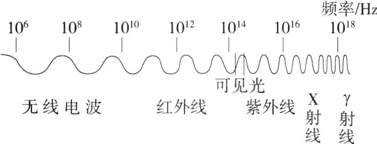 C 在光谱中,红光的外侧是红外线,红外线是不可见光,故A错误;“Hz”是频率的单位,10⁸Hz是指电磁波的频率,故B错误;各种电磁波在真空中的波速相同,无线电波的频率小于X射线的频率,由c = λf可知,无线电波的波长比X射线的长,故C正确,D错误。故选C。