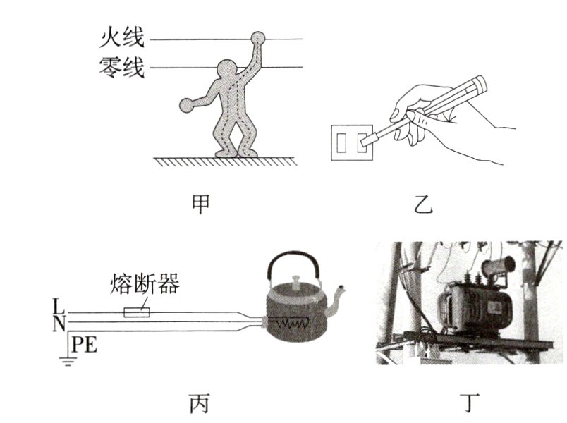 C 图甲中,站在地上的人用手去接触裸露的火线,电流从火线经人体流向大地,会造成触电事故,不符合安全用电原则,故A不符合题意;图乙中,手握住验电笔笔尖金属体去检验插座中的火线,此时等同于手经金属体接触火线,不符合安全用电原则,故B不符合题意;图丙中,电水壶的外壳与接地线相连接,熔断器接在火线上,符合安全用电原则,故C符合题意;图丁中,小孩靠近高压设备嬉戏、玩耍,容易引发高压电弧触电,不符合安全用电原则,故D不符合题意。故选C。