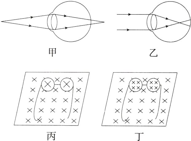 9. (2024四川宜宾中考)据专家介绍,12 - 18岁是青少年近视的高发期,爱眼护眼势在必行。如图所示,______(选填“甲”或“乙”)图表示近视眼成像原理,应佩戴______(选填“丙”或“丁”)图的眼镜进行矫正。