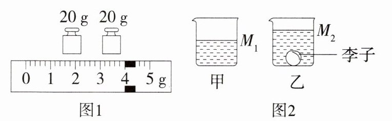 (2)用天平测量李子的质量,当天平平衡时,右盘中的砝码和标尺上游码的位置如图1所示,李子的质量为________g;用量筒和水测得李子的体积为40cm³,则李子的密度为________g/cm³。