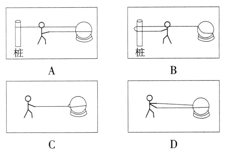 A A方法中有两段绳子挪动石墩,人对绳子的拉力为石墩与地面间的摩擦力的一半;B、C、D方法中,人对绳子的拉力都等于石墩与地面间的摩擦力,即不省力。故选A。