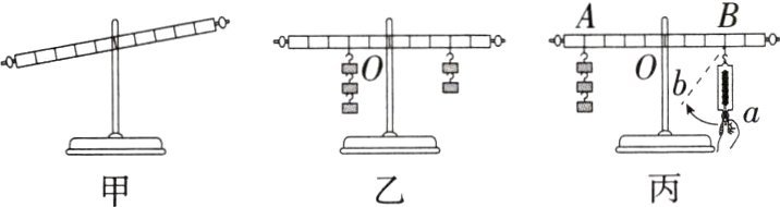 (3)如图丙所示,在A点悬挂3个钩码,在B点用弹簧测力计竖直向下拉,使杠杆在水平位置再次平衡,根据杠杆平衡条件,则有3×0.5N×4L = F×3L,解得F = 2N,即拉力大小为2N;若保持杠杆平衡状态不变,将弹簧测力计由a方向缓慢转动到b方向的过程中,阻力、阻力臂不变,动力臂变小,根据杠杆的平衡条件可知,动力变大,即测力计示数变大。