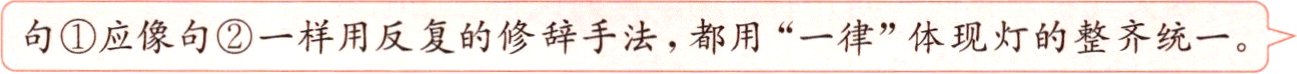 句①应像句②一样用反复的修辞手法,都用“一律”体现灯的整齐统一。