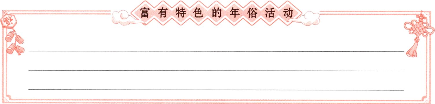7【畅谈年俗】语文课代表正在为宣传册的年俗板块征集文字素材。选择一项你认为家乡最富有特色的年俗活动写下来,将它作为你的投稿作品,注意将重点内容写具体。(选做题)
