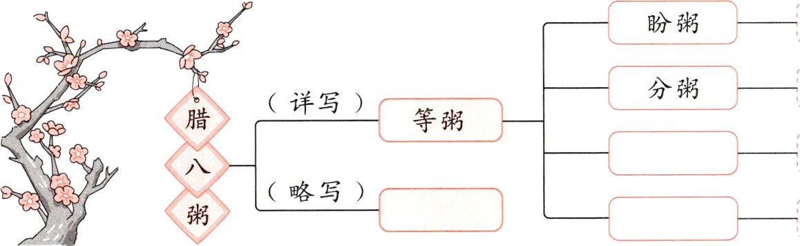 解析 本题考查整体感知和评价鉴赏的能力。完成思维导图,要通读课文,把握课文的主要内容。课文第2~17自然段详写了八儿等粥的情景,其中第9自然段的“只准”和“光”等词语,写出了八儿分粥时的理直气壮;从第13自然段的“锅中的一切,对八儿来说,只能猜想”中可以提取出关键词“猜想”;第14自然段中的“锅中的一切已进了他的眼中”可以凝练成“看”。课文最后两个自然段写的是喝粥的情景。通过阅读课文中等粥的部分,我们能够感受到人们对腊八粥的期盼,这种期盼越强烈就越能体现腊八粥的美味和诱人,同时课文表达的也是人们对腊八粥的期待和喜爱之情,并不是要体现作者的生活经验丰富。