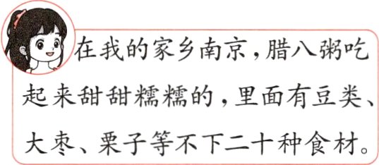 解析 本题考查语言表达的能力。根据同学们的讨论可以得知,不同地区的腊八粥有着不同的味道,这与每个地区的特产息息相关。所以,腊八粥的不同反映着各地风俗与文化的不同,也展示了中华饮食文化的多元性和包容性。对不同口味的腊八粥的了解,也能加深我们对不同地域文化的了解。言之有理即可。