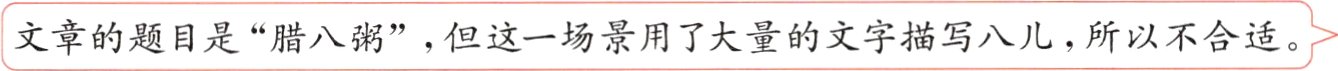 (4)作者正是通过对八儿在等粥时的语言、动作、神态的描写,表现了他的馋样儿和想喝粥的急切心情,从侧面写出了腊八粥的美味诱人,虽然写的是人,但突出的却是粥。所以选这一场景很合适。