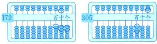 解析 要拨出整百数,就要把3颗珠子都拨在百位上。1颗上珠表示5,加上2颗下珠就是7,表示7个百,即700;3颗下珠表示3,就是3个百,即300。