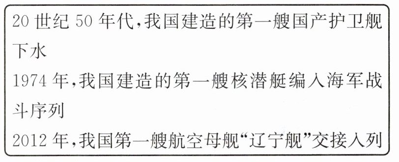 D [解析]根据材料并结合所学知识可知,从第一艘国产护卫舰、第一艘核潜艇到第一艘航空母舰“辽宁舰”交接入列,体现了海军现代化建设不断加强。故选D项。