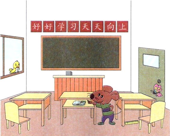 Look! This is Bobby’s classroom. We can see a sign of “好好学习天天向上” ________ the wall. But Bobby wants to play. He looks ________ the bird. The bird is ________ the ________. ________ are Bobby’s books? I don’t know. But Bobby’s pencil case is ________ the desk. A butterfly is ________ another(另一张) desk. And Bobby’s ruler is ________ it.