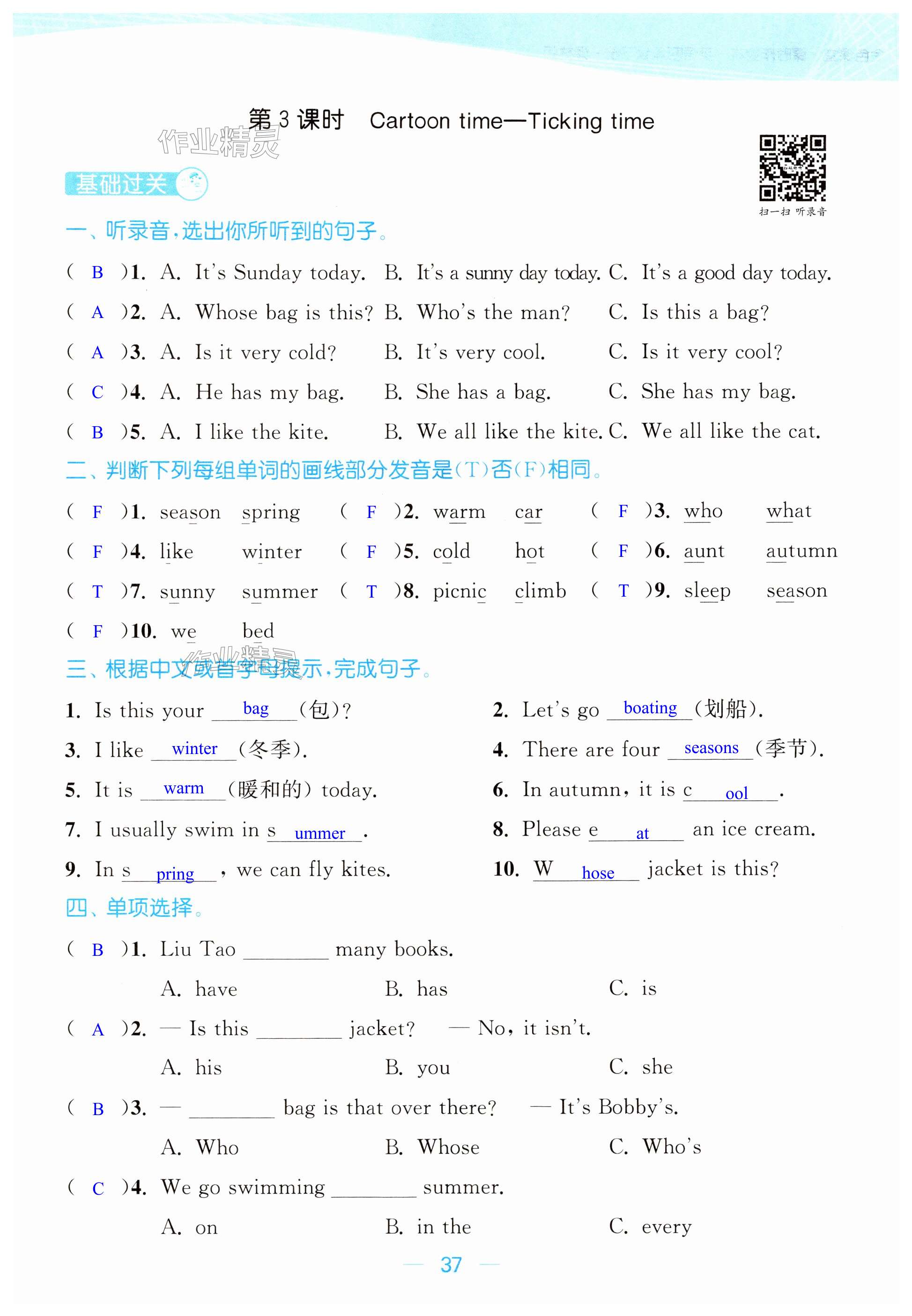 注:目前有些书本章节名称可能整理的还不是很完善,但都是按照顺序排列的,请同学们按照顺序仔细查找。练习册 2025年金色课堂课时作业本四年级英语下册江苏版 答案主要是用来给同学们做完题方便对答案用的,请勿直接抄袭。