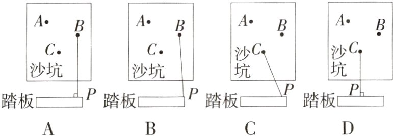 2. 小明参加跳远比赛,他从地面踏板 P 处起跳落到沙坑中,两脚后跟与沙坑的接触点分别为 A,B,小明未站稳,一只手撑到沙坑 C 点处,则跳远成绩测量正确的图是 ( )